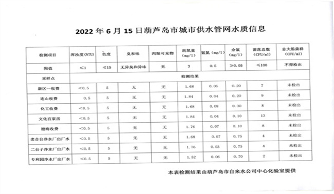 2022年6月15日葫芦岛市城市供水管网水质信息