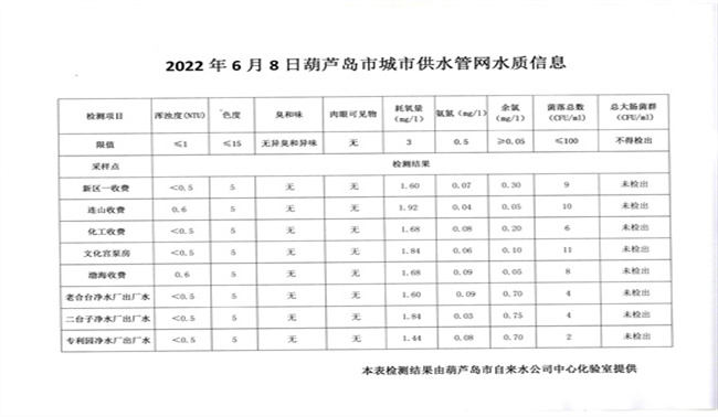 2022年6月8日葫芦岛市城市供水管网水质信息