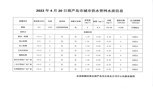 2022年4月20日葫芦岛市城市供水管网水质信息