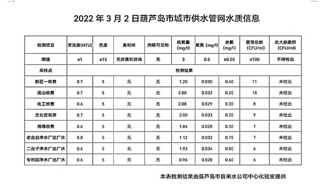 2022年3月2日葫芦岛市城市供水管网水质信息