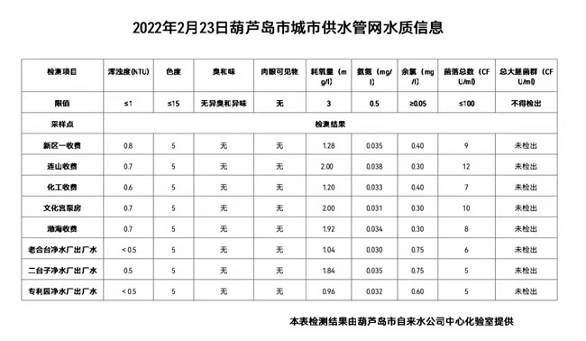 2022年2月23日葫芦岛市城市供水管网水质信息