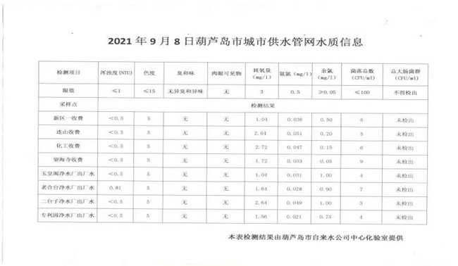 2021年9月8日葫芦岛市城市供水管网水质信息