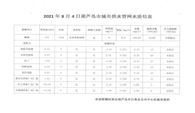 2021年8月4日葫芦岛市城市供水管网水质信息