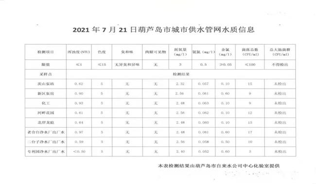 2021年7月21日葫芦岛市城市供水管网水质信息