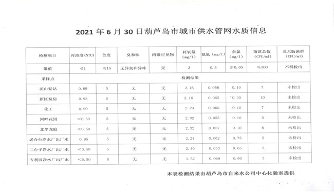 2021年6月30日葫芦岛市城市供水管网水质信息