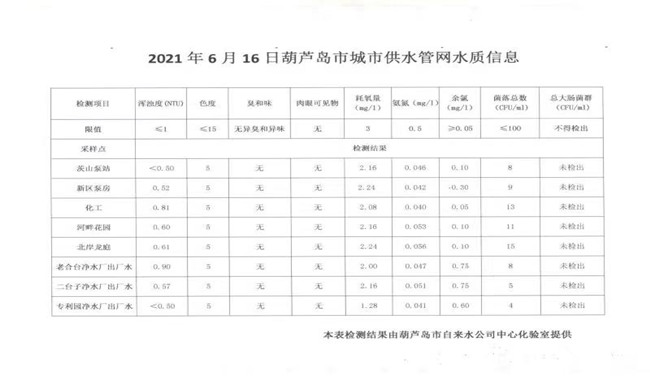 2021年6月16日葫芦岛市城市供水管网水质信息