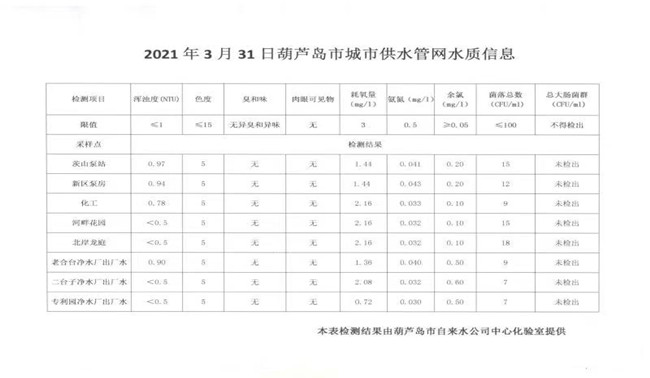2021年3月31日葫芦岛市城市供水管网水质信息