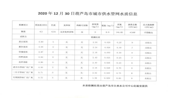 2020年12月30日葫芦岛市城市供水管网水质信息