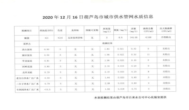 2020年12月16日葫芦岛市城市供水管网水质信息