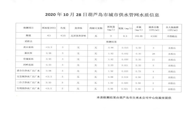 2020年10月28日葫芦岛市城市供水管网水质信息