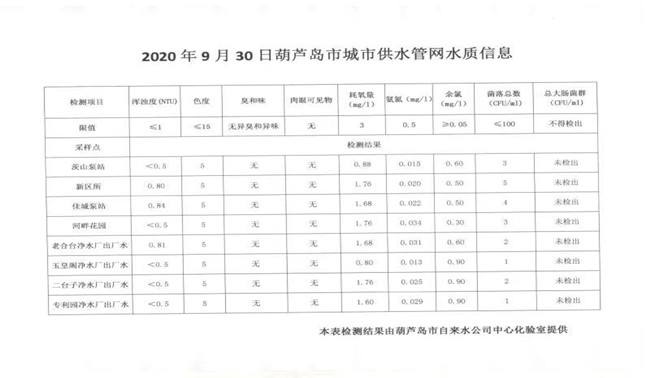 2020年9月30日葫芦岛市城市供水管网水质信息